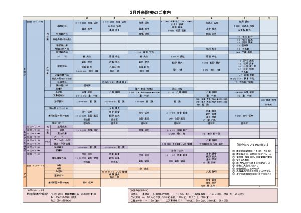 3月の外来診療の予定が決まりました。